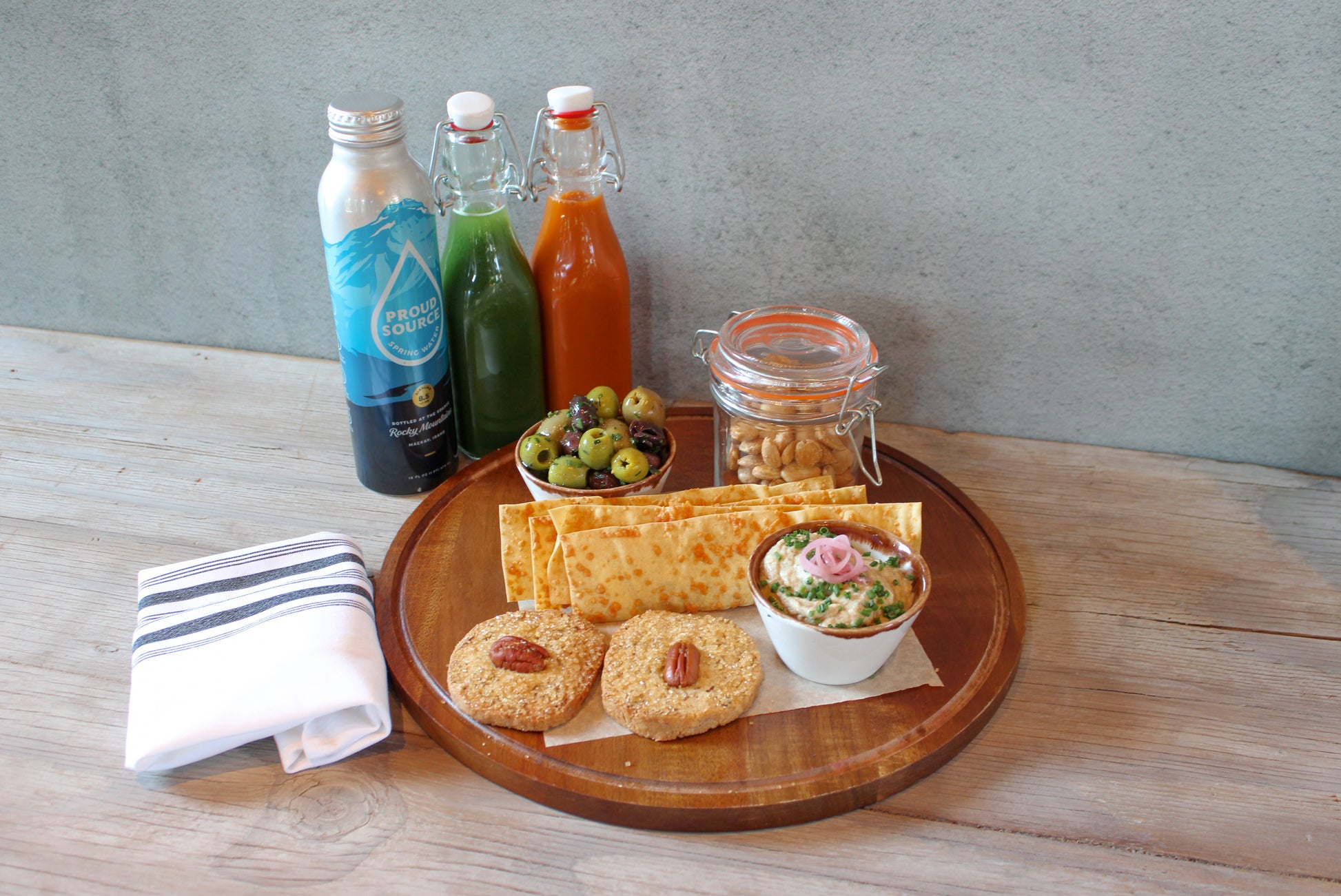 Vibrant green juice and carrot ginger juice, bottle of water, glass jar of roasted marcona almonds, small bowl of garlic roasted hummus and spiced cracker strips, small bowl of marinated olives and two pecan sandies *2 person version will include additional juices, water and pecan sandies